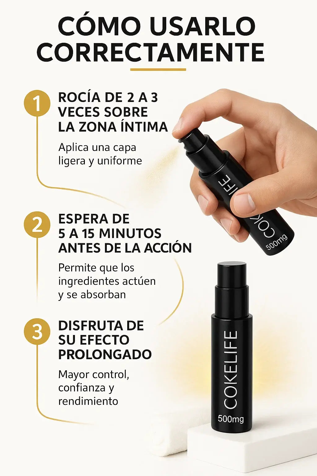Aplica el spray entre 10 y 15 minutos antes del momento íntimo. Así el producto actúa de forma gradual, ayudando a controlar mejor tu rendimiento y mantener la confianza sin ansiedad.